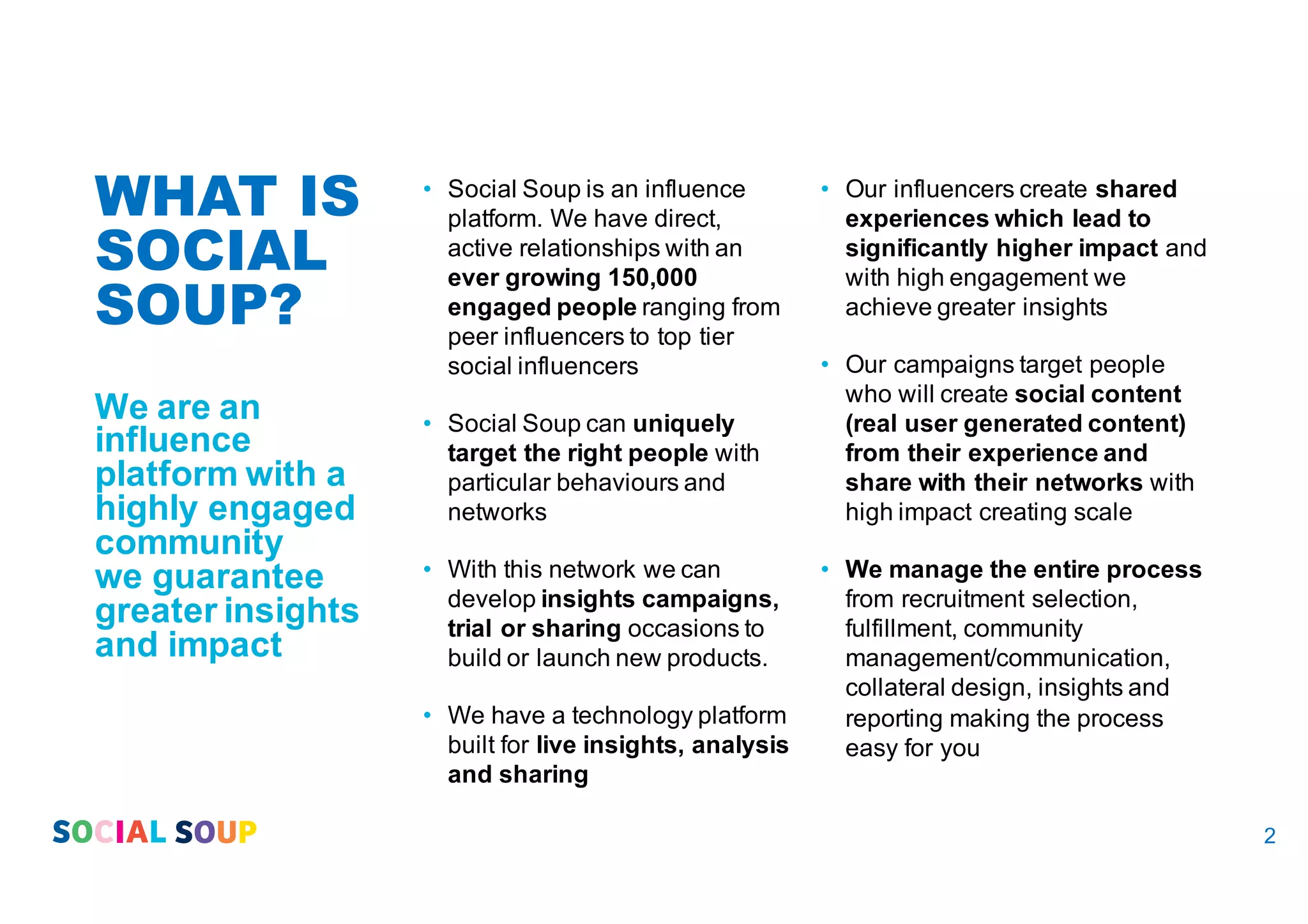 Social Soup is an influencer marketing platform with a community of 150,000 engaged users, focusing on the creation and sharing of user-generated content (UGC) to enhance brand impact. UGC is becoming increasingly crucial in marketing due to its persuasive power and higher trust levels compared to traditional advertising. The document highlights successful case studies and emphasizes the importance of creating opportunities for content generation to leverage social proof in marketing strategies.