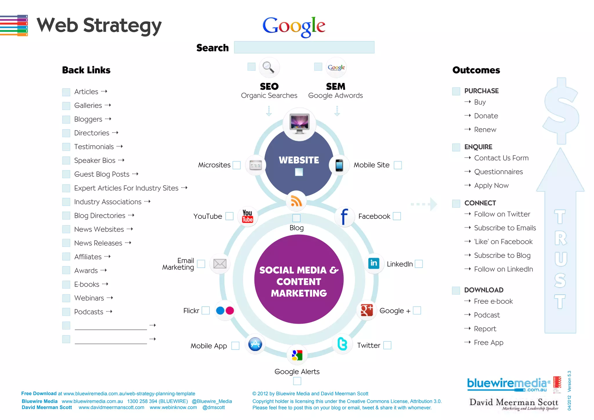 The document outlines a web strategy template for planning search engine optimization, social media marketing, content marketing, and buyer personas. It includes sections for mapping out backlinks, organic and paid search, social media channels, website sections, and metrics for purchases, enquiries, connections and downloads. Buyer personas are to be defined including problems solved, actions desired, proof of solutions, and keywords relevant to each persona. Content and tactics are distinguished as the "king" and "queen" of marketing strategy and planning.