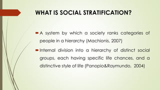 Social stratification refers to a system that ranks categories of people in a hierarchy. It is a universal trait of society that is passed down generations and involves inequality as well as beliefs. There are three main systems of social stratification - caste, class, and meritocracy. Caste is based on ascription or birth alone and allows little social mobility. Class systems consider both birth and individual achievements, allowing some choice and mobility. Meritocracy ranks people based on personal merit. In medieval Britain, there was a caste-like system with the clergy, nobility, and commoners comprising the three estates.
