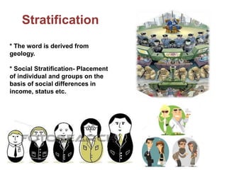 The document discusses social stratification and the caste system in India, highlighting its historical evolution and implications for social, economic, and political aspects. It outlines various types of stratification, consequences of caste discrimination, and special constitutional provisions for marginalized groups. The document emphasizes the ongoing issues of social inequality and the need for reform to uplift lower castes and ensure equal rights.