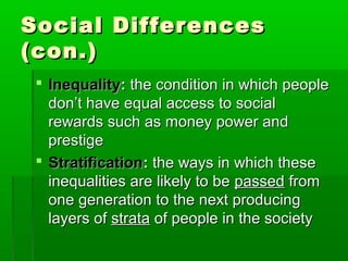 The document discusses social differences and social stratification. It notes that sociologists study differences in terms of inequality, stratification, and class. Inequality refers to unequal access to social rewards, stratification refers to how inequalities are passed down through generations, and class refers to social groups with unequal access to wealth, power, and prestige. The document then examines different systems of social stratification including slavery, castes, estates, and social class. It discusses Karl Marx's theory of class struggle and exploitation as well as Max Weber's focus on class, status, and power. Finally, it defines social mobility as movement within a stratification system and describes different types.