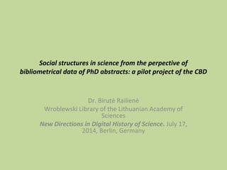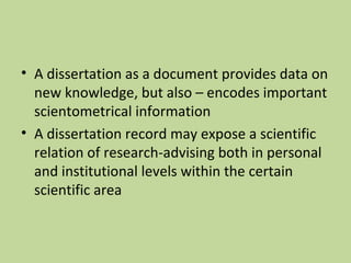 The document outlines a pilot project focused on analyzing bibliometrical data from PhD abstracts to understand scientific social structures and research advising in Lithuania. It discusses the historical context of bibliographical traditions, the importance of cataloging practices, and proposes changes to enhance data accessibility. Additionally, it highlights the efforts of collaboration among research libraries to improve access to European theses and the challenges faced in achieving global search uniformity.