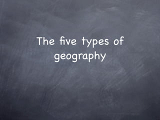 There are five main types of geography: location, which refers to a place's longitude and latitude; place, which describes where something is located; climate, which is the long-term weather patterns of an area; human environment interaction, how humans impact and are impacted by their surroundings; and environment, the conditions surrounding where people live. The document provides a brief definition of each of the five main types of geography.