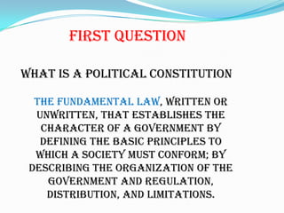 This document is a social studies project that discusses forms of government. It begins by defining a political constitution as the fundamental law that establishes the basic principles and organization of a government. It then discusses several forms of government including: