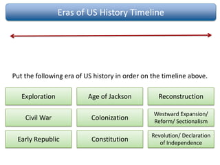 The document provides an overview of key eras in American history from exploration through the early republic. It includes timelines and descriptions of events such as European exploration of North America in search of gold, glory, and spreading religion; the 13 original colonies and reasons for their establishment; conflicts like the French and Indian War; and documents like the Declaration of Independence and Articles of Confederation. The information is presented through timelines, maps, and explanations of political, economic and social factors during different periods of early American history.