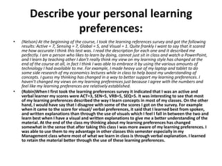 We both found that exploring our learning preferences and using social technologies for collaboration helped us be more successful students. Nelson preferred using technologies like Google Docs and tablets for notes, while Robin benefited from video chat for verbal explanations. Though we had different preferences, we agreed social networks allowed us to work together remotely. Going forward, we will apply these skills in our careers by collaborating with networks anywhere in the world using video, documents, and other shared platforms for discussions, presentations, and spreading knowledge. While some social tools like Twitter were less effective for in-depth learning, platforms allowing real-time collaboration helped us most.