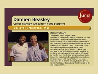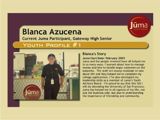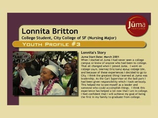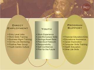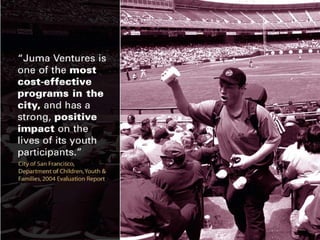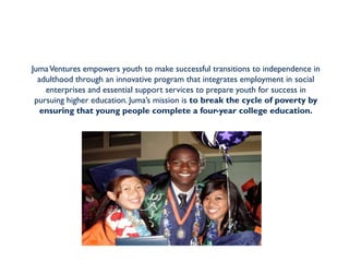 Juma Ventures empowers youth to transition to adulthood through a program integrating employment in social enterprises and support services aimed at achieving higher education. The organization focuses on breaking the cycle of poverty by providing jobs, financial education, and college access, while cultivating significant relationships between youth and staff to foster individual growth. Additionally, Juma plans to expand nationally and enhance their financial operations to support their mission further.
