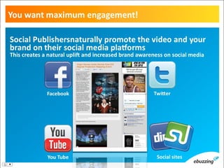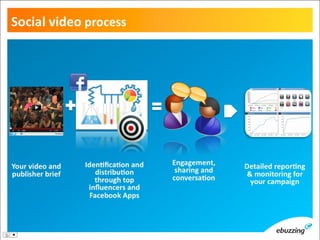 This document summarizes an upcoming event called "Social Meets Video" taking place in London from May 22-23. The event will focus on social video advertising and engagement. Key topics that will be discussed include the importance of engagement over other metrics, distribution strategies for social video, ensuring brand safety, and leveraging platforms like Facebook for in-game video views through opt-in models. Case studies will also be presented on how social games can increase brand awareness.