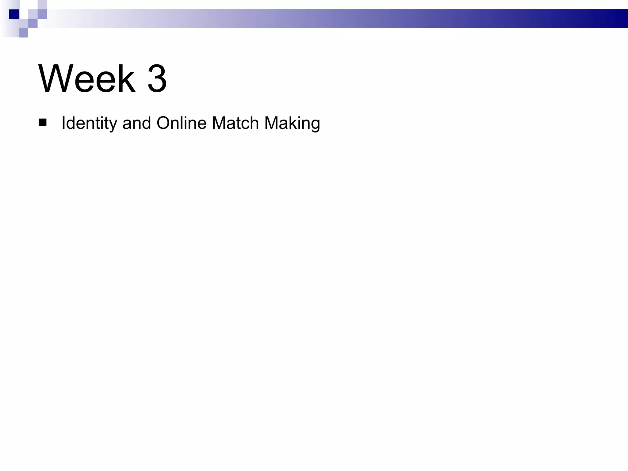 The document discusses the implications of social technologies on digital media, focusing on identity management and online matchmaking through various social contexts. It explores the advantages and disadvantages of online identity, self-presentation, and the complexities of maintaining multiple roles in digital environments. Additionally, it highlights the relationship between user profiles and online dating systems, along with practical applications for enhancing user experiences with social technologies.