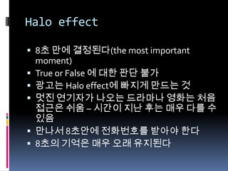 Halo effect8초 만에결정된다(the most important moment)True or False 에 대한 판단 불가광고는 Halo effect에 빠지게 만드는 것멋진 연기자가 나오는 드라마나 영화는 처음 접근은 쉬움 – 시간이 지난 후는 매우 다를 수 있음만나서 8초안에 전화번호를 받아야 한다8초의 기억은 매우 오래 유지된다