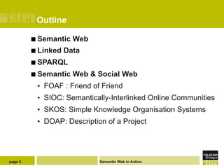 The document discusses several ontologies for the social web including FOAF, SIOC, and SKOS. FOAF describes personal information and social networks. SIOC provides methods for interconnecting online communities like blogs and forums. It aims to address interoperability issues on the social web. SIOC has been adopted in over 400 sites and has the potential to become a foundational vocabulary for the semantic web.