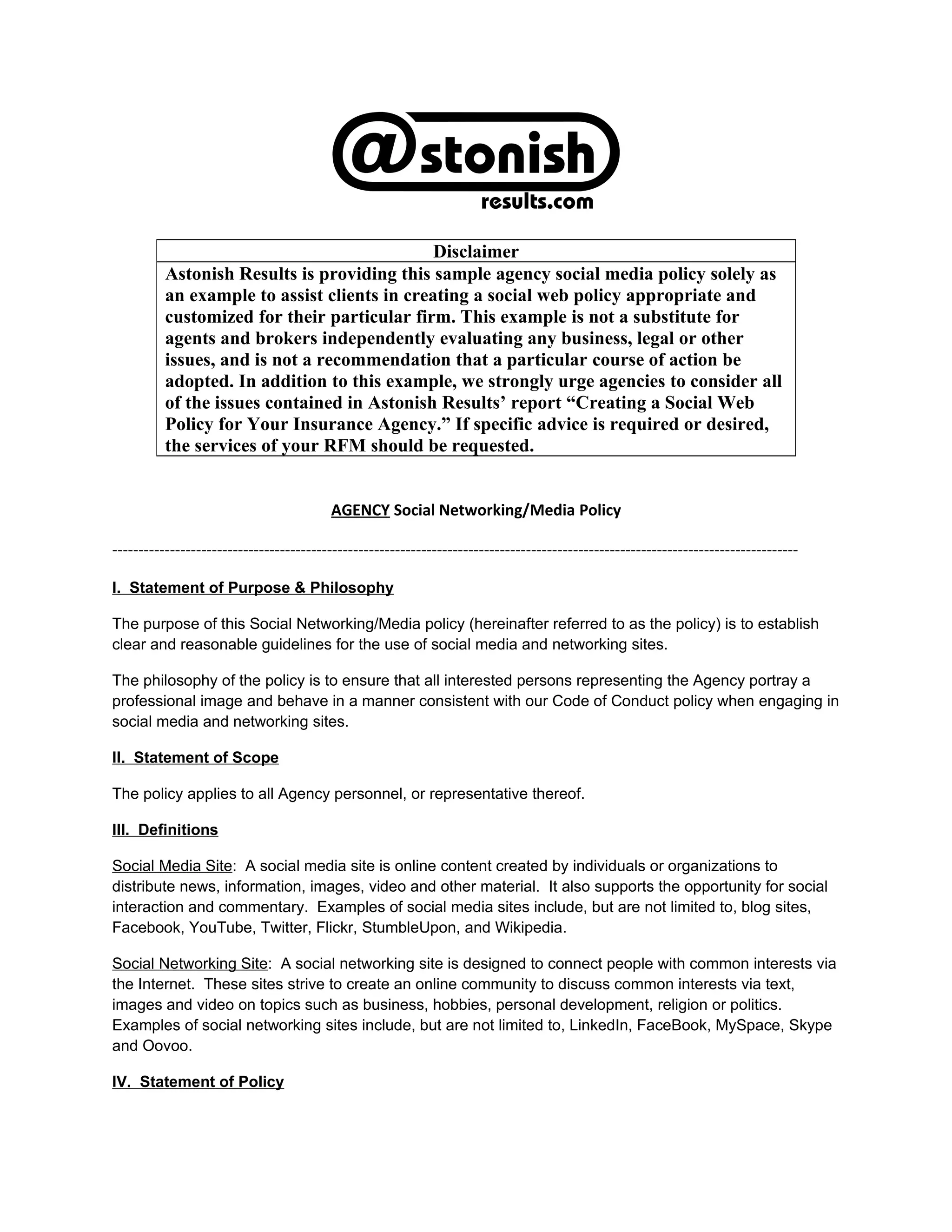 This document provides a sample social media policy for insurance agencies with 3 main points: