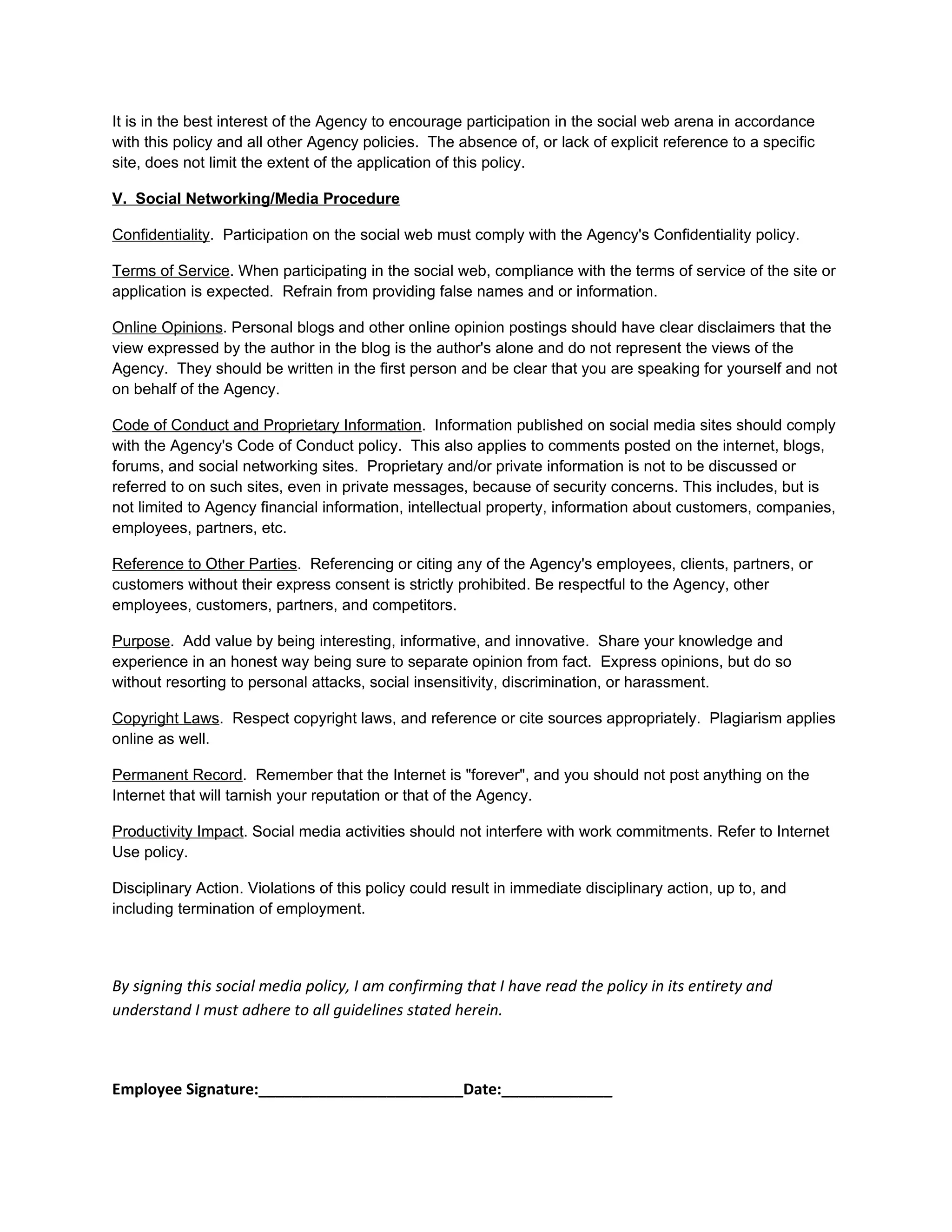3. The policy outlines procedures for social media use regarding confidentiality, terms of service, opinions, proprietary information, referencing others, purpose, copyright, permanent records, productivity, and disciplinary action for violations. Employees must sign agreeing to adhere to the guidelines.