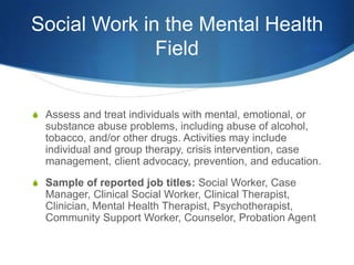 Social workers in the mental health field assess and treat individuals with mental, emotional, or substance abuse issues through therapies, case management, and prevention/education efforts. Concentrations include suicide prevention, especially for adolescents and youth, where suicide is a leading cause of death. Risk factors for suicide ideation include depression, low self-esteem, and lack of support systems. The author wishes to work on a macro-level in areas like policy, advocacy, research, and legislation to help at-risk groups like LGBT youth who are disproportionately impacted by suicide risks.