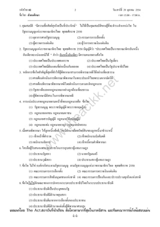 วันเสาร์ที่ 29 ตุลาคม 2554 ชื่อวิชา สังคมศึกษา เวลา 15.00– 17.00น. -------------------------------------------------------------------------------------------------------------------------------- 1. คุณสมบัติ “มีความซื่อสัตย์สุจริตเป็นที่ประจักษ์” ไม่ได้เป็นคุณสมบัติของผู้ที่จะดํารงตําแหน่งใด ใน รัฐธรรมนูญแห่งราชอาณาจักรไทย พุทธศักราช 2550 (1) ตุลาการศาลรัฐธรรมนูญ (2) กรรมการการเลือกตั้ง (3) ผู้ตรวจการแผ่นดิน (4) ผู้ว่าการตรวจเงินแผ่นดิน 2. รัฐธรรมนูญแห่งราชอาณาจักรไทย พุทธศักราช 2550 บัญญัติว่า “ประเทศไทยเป็นราชอาณาจักรอันหนึ่ง อันเดียวจะแบ่งแยกมิได้ " คําว่า อันหนึ่งอันเดียว มีความหมายตามข้อใด (1) ประเทศไทยเป็นประเทศเอกราช (2) ประเทศไทยเป็นรัฐเดี่ยว (3) ประเทศไทยมีดินแดนที่ต่อเนื่องกันตลอด (4) ประเทศไทยเป็นรัฐประชาธิปไตย 3. หลักการข้อใดสําคัญที่สุดที่ทําให้ผู้พิพากษาสามารถพิจารณาคดีได้อย่างเที่ยงธรรม (1) ศาลต้องดําเนินการพิจารณาพิพากษาในพระปรมาภิไธยพระมหากษัตริย์ (2) ศาลต้องพิจารณาพิพากษาคดีโดยดําเนินการตามหลักกฎหมาย (3) รัฐสภาต้องออกกฎหมายมาอย่างถูกต้องเที่ยงธรรม (4) ผู้พิพากษามีอิสระในการพิพากษาคดี 4. การแบ่งประเภทกฎหมายตามหน้าที่ของกฎหมายคือ ข้อใด (1) รัฐธรรมนูญ พระราชบัญญัติ พระราชกฤษฎีกา (2) กฎหมายเอกชน กฎหมายมหาชน (3) กฎหมายสารบัญญัติ กฎหมายวิธีสบัญญัติ (4) กฎหมายแพ่ง กฎหมายอาญา กฎหมายปกครอง 5. เมื่อศาลพิพากษา ให้ลูกหนี้แพ้คดี ใครมีอํานาจยึดทรัพย์สินของลูกหนี้มาชําระหนี้ (1) เจ้าหน้าที่ตํารวจ (2) เจ้าพนักงานบังคับคดี (3) พนักงานอัยการ (4) เจ้าหนี้ตามคําพิพากษา 6. ใครคือผู้รับสนองพระบรมราชโองการยุบสภาผู้แทนราษฎร (1) ประธานรัฐสภา (2) นายกรัฐมนตรี (3) ประธานวุฒิสภา (4) ประธานสภาผู้แทนราษฎร 7. ข้อใด ไม่ใช่ องค์กรอิสระตามรัฐธรรมนูญ ตามรัฐธรรมนูญแห่งราชอาณาจักรไทย พุทธศักราช 2550 (1) คณะกรรมการการเลือกตั้ง (2) คณะกรรมการตรวจเงินแผ่นดิน (3) คณะกรรมการสิทธิมนุษยชนแห่งชาติ (4) คณะกรรมการป้องกันและปราบปรามทุจริตแห่งชาติ 8. ข้อใดไม่ใช่ลักษณะของการปกครองระบอบประชาธิปไตยในระบบประธานาธิบดี (1) ประธานาธิบดีเป็นประมุขของรัฐ (2) ประธานาธิบดีมีอํานาจยุบสภา (3) ประธานาธิบดีมาจากการเลือกตั้งของประชาชน (4) ประธานาธิบดีมีอํานาจแต่งตั้งผู้พิพากษาศาลสูง w w w .theactkk.net à¼Âá¾Ãèâ´Â The Act.ʶҺѹ·Õè¹Ñ¡àÃÕ¹ µÔ´â¤ÇµÒÁÒ¡·ÕèÊØ´ã¹ÀÒ¤ÍÕÊÒ¹ áÅзÕÁ¤³Ò¨ÒÃÂìà¡ç§¢éÍÊͺáÁè¹