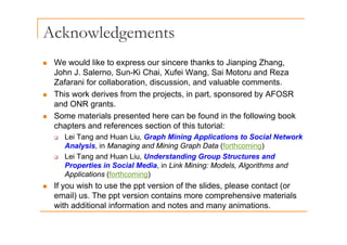 This document discusses community detection and behavior prediction in social networks using data mining techniques. It introduces key concepts in social media and networking, outlines common data mining tasks like community detection and centrality analysis, and evaluates different methods. Community detection aims to identify tightly knit groups within networks, while behavior prediction uses network structure and attributes to predict node characteristics. The document also discusses data visualization and modeling of social networks.