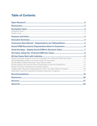 This document outlines 18 use cases for social CRM, which is an approach to relationship management that utilizes social media and online conversations to engage customers. It discusses how customers have increasingly adopted social technologies and moved conversations online, leaving companies struggling to keep up. Social CRM can help by connecting business units to social conversations in real-time through enterprise software. The 18 use cases are organized into 7 categories: social customer insights, social marketing, social sales, social support/service, social innovation, collaboration, and seamless customer experience. Implementing social CRM brings social networks back into existing CRM systems to enhance customer relationships.