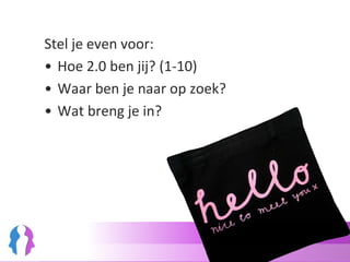 Resultaat cursusSociale mediate koppelen aan je dagelijkse werkzaamheden » van nice to have naar need to have;Beter omgaan met grote(re) hoeveelheden informatie » filters in stelling;Vaardigheden om met (vrij) beschikbare tools om te gaan » digitaliteit;Tijdig signaleren van zaken die jouw werkveld raken » signaal op afroep;Beter benutten van je (onaangeboorde) netwerk » netwerk in kaart.Kortom, na afloop ben je in staat slimmer en productiever (samen) te werken met behulp van de sociale media.