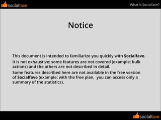 The document provides an overview of the Socialfave application, a web tool designed for managing and analyzing Twitter profiles through four main modules: tweets, community, scheduler, and public profile. Users can filter and analyze tweets, manage community interactions, schedule tweets, and publish selected tweets on a public profile. It is noted that not all features are available in the free version of the software, and the document is intended to give a quick introduction rather than a comprehensive guide.
