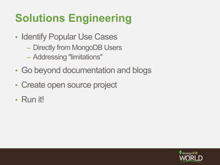 The document outlines the development of a social platform utilizing MongoDB, focusing on various architectural decisions such as user timeline caching, schema indexing, and operational testing. Key features include a fanout feed model for content delivery and an open-source project called Socialite, which serves as a reference implementation. It also discusses benchmarking results and specific challenges encountered during scaling considerations and content management.