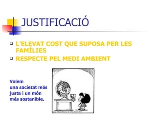 JUSTIFICACIÓ L’ELEVAT COSTQUE SUPOSA PER LES FAMÍLIES RESPECTE PEL MEDI AMBIENT Volem una societat més justa i un món més sostenible.