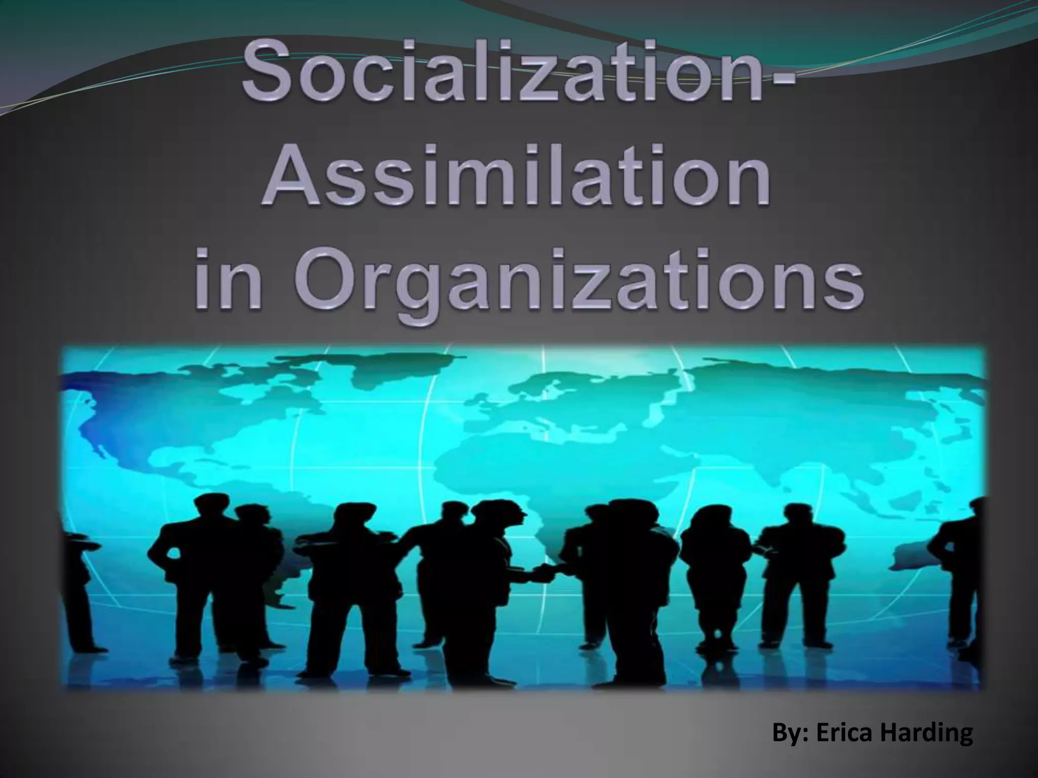 The document discusses socialization and assimilation within organizations. It outlines three stages of assimilation: 1) the anticipatory stage where a new member forms expectations before joining, 2) the encounter stage where the new member learns organizational norms and requirements, and 3) the metamorphosis stage where the new member masters requirements and adjusts to the organization. The document also discusses how modern technology like social media has influenced the anticipatory stage by allowing new members to research organizations online before joining.