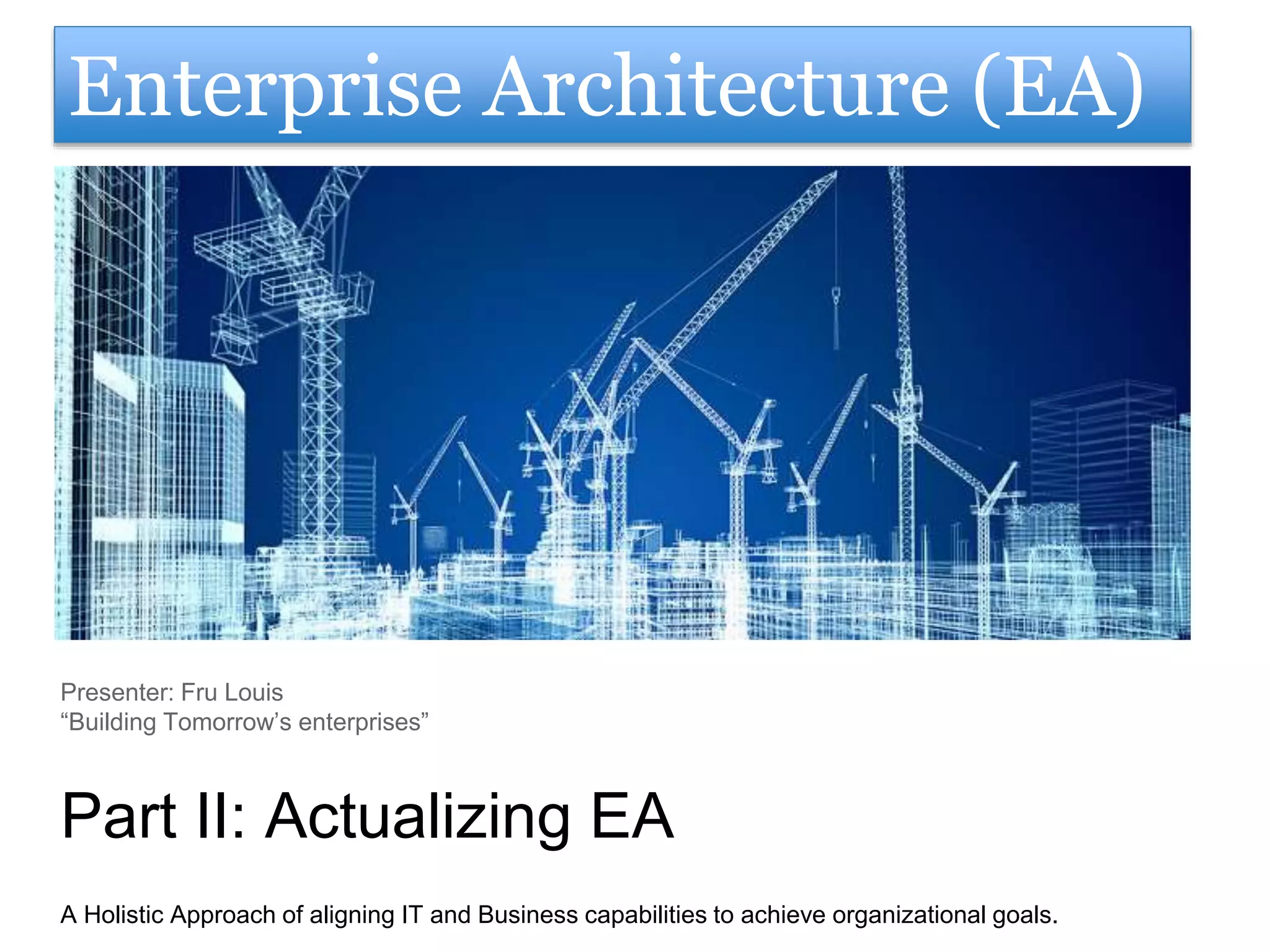 The document discusses actualizing an enterprise architecture (EA) practice at an organization. It describes taking EA from low maturity to high maturity through a three phase journey. The phases include socializing the need for EA, gaining executive sponsorship, and establishing the EA program. It also discusses rethinking the IT department as proactive rather than reactive. Building an EA team with core and extended members is recommended. Quick wins should be shown to gain buy-in and adoption should be driven from top-down and bottom-up.