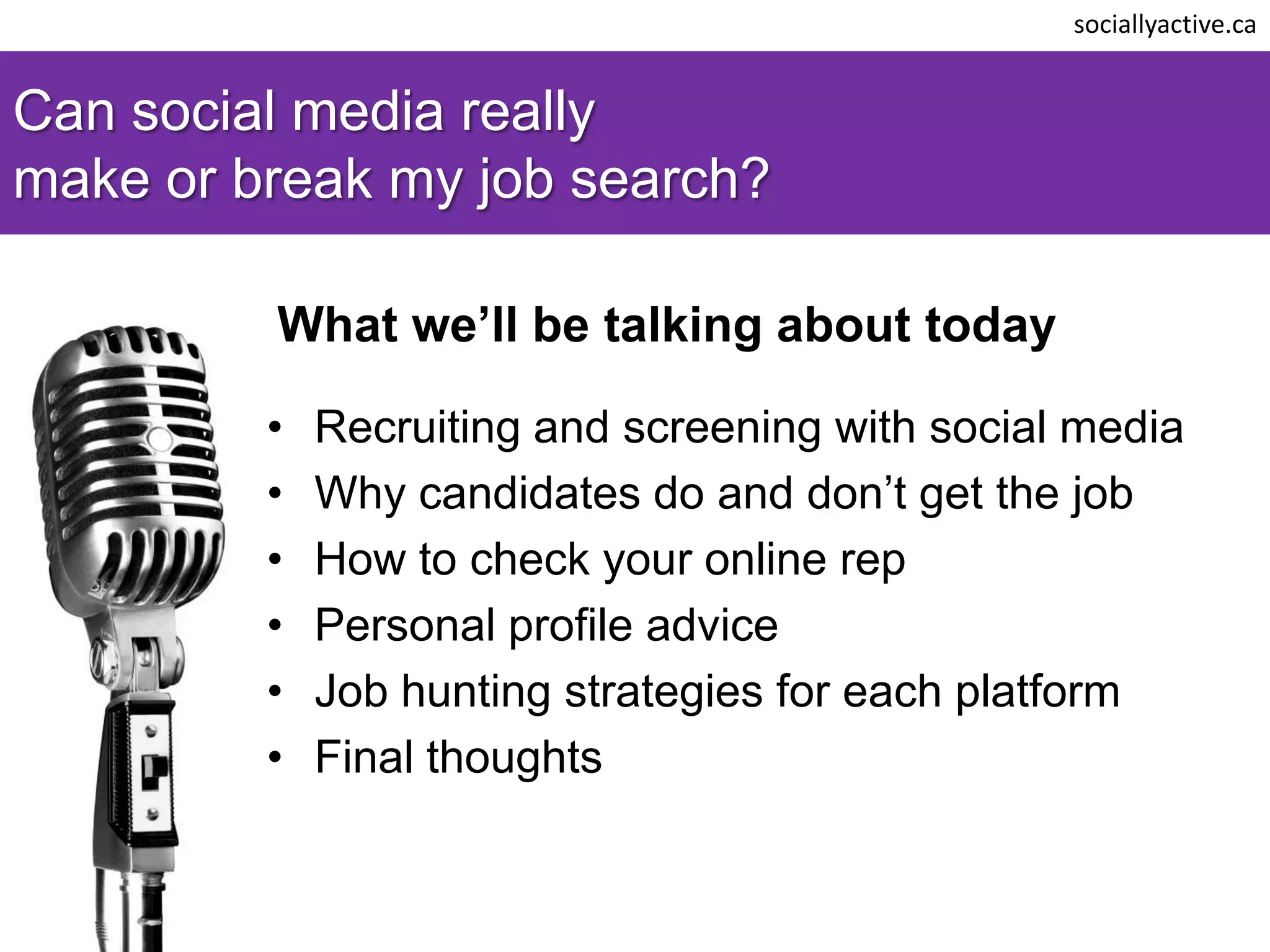 The document discusses the impact of social media on job hunting, highlighting that over 80% of employers use social media for recruitment. It outlines common reasons candidates are not hired or selected based on their online presence and provides profile advice for job seekers. The final messages emphasize the importance of maintaining a positive personal brand and actively managing online profiles.
