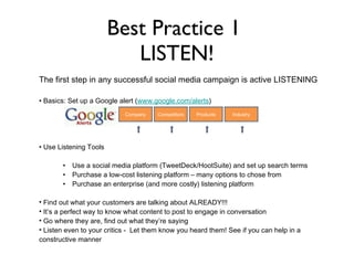 The document outlines seven best practices for using social media effectively. The first is to listen to what customers are saying online to understand their needs and concerns. The second is to engage customers by posting relevant content that sparks conversations. The third is to position your business as a valuable source of information on your industry or products. The remaining best practices discuss being transparent about your identity, responding to customers in a timely manner, empowering supporters to promote your brand, and archiving social media posts for legal and data protection purposes.