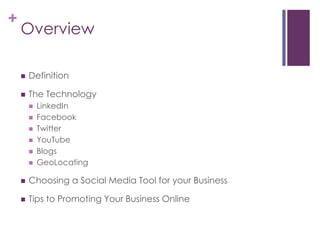 This document provides an overview of using social media for self-promotion and business purposes. It defines social networking sites and discusses popular platforms like LinkedIn, Facebook, Twitter, YouTube, and blogs. Tips are provided on using each platform to promote a business, including linking accounts for cross-promotion. The document also discusses the benefits of social media for small businesses and tips for an effective social media strategy and online presence.