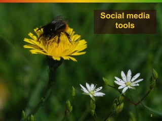 This document discusses using social media tools effectively and avoiding potential problems. It provides an overview of common social media platforms like LinkedIn, Facebook, and Twitter and how each can be used to build professional networks or share updates. It emphasizes managing your digital footprint and online presence, as well as tips to prevent issues like oversharing personal information, exposure to scams or spammers, and information connecting unexpectedly. The document also discusses using social media to support a group and provides resources for continuing to learn about tools, techniques, and how to stay aware of privacy and security issues online.