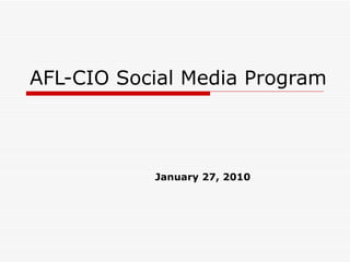 The document discusses the AFL-CIO's social media program and platforms. It notes that 3 out of 4 Americans use social media and that the AFL-CIO uses platforms like blogs, Facebook, Twitter, YouTube, and Flickr to spread its message and engage constituents. It provides details on the reach and use of each platform and describes social media trainings that are provided to teach effective use of social media.