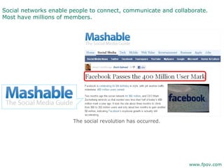 This document discusses how businesses are using social networks. Social networks allow people to connect, communicate, and collaborate, and most have millions of members. Many leading companies are creating their own social networks and integrating social aspects into their websites. Businesses are using social networks to connect with customers, raise awareness of products and services, engage customers, create new revenue opportunities, turn customers into brand ambassadors, support existing customers, crowdsource feedback, acquire new customers, and have direct two-way dialogs. The document provides examples of businesses with social networks and white label social media platforms.