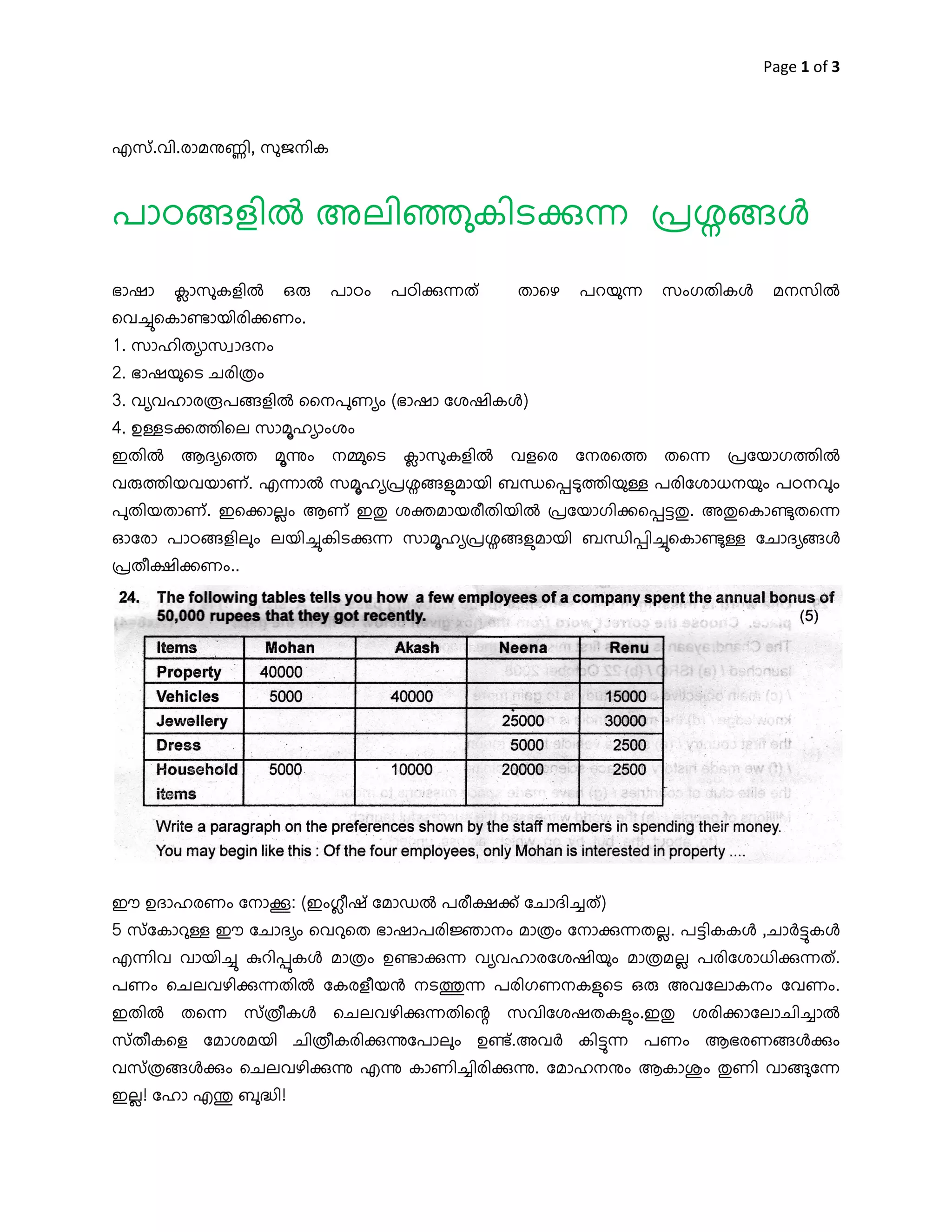 അലി«കിടpë ûശj ഭാഷാ കാസകളിi ഒ പാഠം പഠിpëത് താെഴ പറയë സംഗതികj മനസിi െവ’െകാµായിരിoണം. 1. സാഹിത ാസ ാദനം 2. ഭാഷയെട ചരിÏം 3. വ വഹാര പളിi ൈനപണ ം (ഭാഷാ േശഷികj) 4. ഉ ടoÀിെല സാമഹ ാംശം ഇതിi ആദ െÀ മìം ന െട കാസകളിi വളെര േനരെÀ തെë ûേയാഗÀിi വ Àിയവയാണ് . എëാi സമഹ ûശളമായി ബèെùടÀിയ പരിേശാധനയം പഠനവം പതിയതാണ് . ഇെoാലം ആണ് ഇ½ ശtമായരീതിയിi ûേയാഗിoെù½. അ½െകാµതെë ഓേരാ പാഠളിലം ലയി’കിടpë സാമഹ ûശളമായി ബèിùി’െകാµ േചാദ j ûതീzിoണം.. ഈ ഉദാഹരണം േനാq: (ഇംഗീഷ് േമാഡi പരീzo് േചാദി’ത് ) 5 സ് േകാറ ഈ േചാദ ം െവറെത ഭാഷാപരിžാനം മാÏം േനാpëതല. പികകj ,ചാhകj എëിവ വായി’ kറിùകj മാÏം ഉµാpë വ വഹാരേശഷിയം മാÏമല പരിേശാധിpëത് . പണം െചലവഴിpëതിi േകരളീയg നടÁë പരിഗണനകളെട ഒ അവേലാകനം േവണം. ഇതിi തെë സ് Ïീകj െചലവഴിpëതിെ÷ സവിേശഷതകളം.ഇ½ ശരിoാേലാചി’ാi സ് തീകെള േമാശമയി ചിÏീകരിpìേപാലം ഉµ് .അവh കിë പണം ആഭരണjpം വസ് Ïjpം െചലവഴിpì എì കാണി’ിരിpì. േമാഹനÜം ആകാ ം ½ണി വാേë ഇല! േഹാ എá ബÖി!