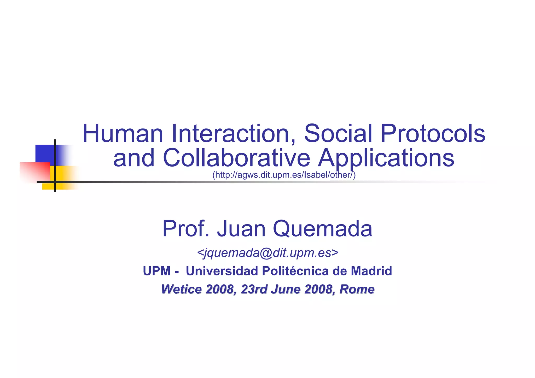 Prof. Juan Quemada gave a presentation on social protocols and how they relate to human interaction and collaborative applications. He discussed how humans are inherently social and wired to connect with others. He explored how social protocols can be explicitly represented to trigger cognitive and behavioral processes that enable group work. Quemada also examined how context and interaction models can be defined and implemented in applications like Isabel to support remote interactions similar to co-located interactions. He argued that collaborative applications should be designed based on social protocols to help users feel connected to others.