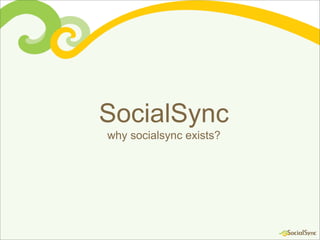 SocialSync is a platform that aims to help the over 0.5 million NGOs in India establish an online presence and leverage new media tools to connect with wider audiences. It recognizes that while many NGOs are doing commendable work on the ground, they have an nearly nonexistent web presence. SocialSync provides tools to help NGOs create a distinctive web identity, showcase their work, and build social capital by involving online communities and collaborations through elements like social campaigning and idea sharing. The goal is to help channel user involvement towards social causes by connecting NGOs with their constituencies and opening channels for participation through established web identities.