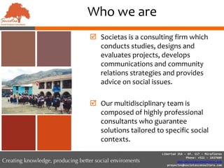 Societas is a Peruvian consulting firm that conducts social studies and projects to build knowledge and foster better social environments. Their multidisciplinary team provides services in areas like rural development, urban planning, extractive industries, and corporate social responsibility. Services include stakeholder mapping, social impact assessments, and strategic planning. The firm aims to design practical and responsible solutions for clients and facilitate dialogue between stakeholders.