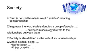 The document defines and discusses the key concepts of society. It begins by defining society as a group of people and their relationships. It describes some key elements and characteristics of society, including mutual interaction, interdependence, cooperation, and a pattern of social control. The document then discusses different types of societies, including tribal societies characterized by kinship and nomadism, agrarian societies focused on agriculture, and industrial societies with specialized division of labor and impersonal relationships.