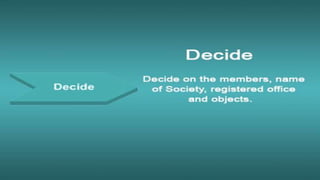 The document discusses society registration in India. It states that a society is an association of people united to act jointly for a common purpose. Societies are usually registered for charitable activities like education, art, religion, etc. The Societies Registration Act of 1860 lays out the procedure for registering and operating societies in India, with the aim of promoting literature, science, arts or diffusion of useful knowledge for charitable purposes. The document then outlines the purposes a society can be registered for and provides details on the procedure for registering a society, including drafting memorandums and bylaws, and registering with the sub-registrar and registrar of societies.