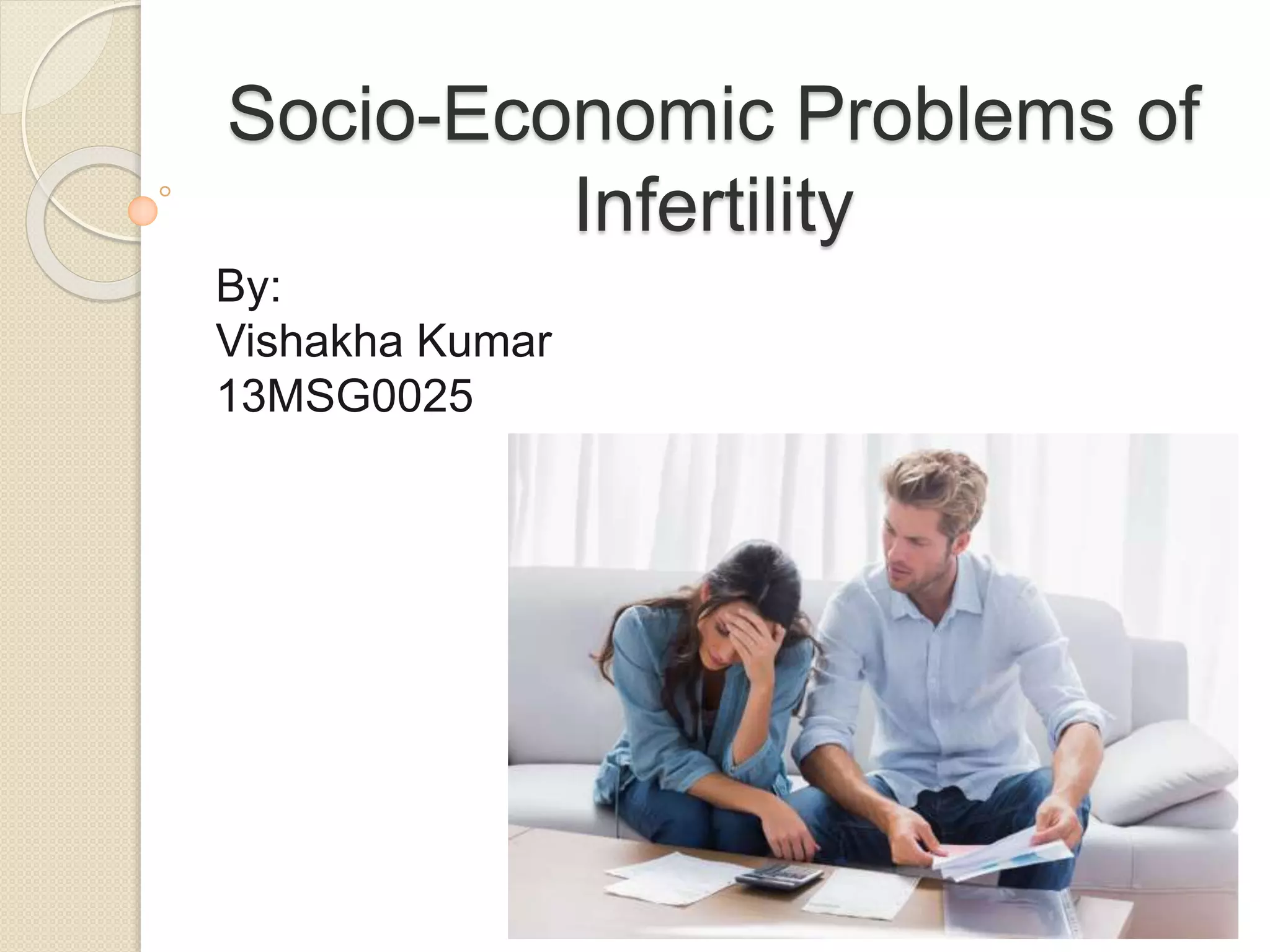 This document discusses the socio-economic problems of infertility. It defines infertility as the inability of a sexually active, non-contracepting couple to achieve pregnancy in one year. Reasons for infertility include hormonal imbalances, reproductive organ issues, and medication side effects. Infertile couples experience social withdrawal over time as failed pregnancy attempts cause increased sadness and unwillingness to share problems. Treatment costs are also a major economic problem, ranging from tens of thousands to over $100,000 per cycle depending on the procedures. Developing countries tend to view infertility more negatively from a social perspective compared to Western nations.