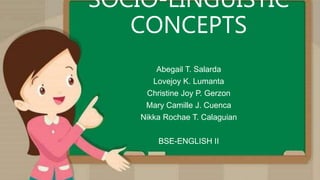 The document discusses several key sociolinguistic concepts including bilingualism, language change, language shift, code switching, language death and revival, standard languages, vernacular languages, national languages, official languages, pidgins, regional dialects, and social dialects. It defines each concept and provides details on types and factors that influence them. The document is a guide to understanding how language interacts with society.