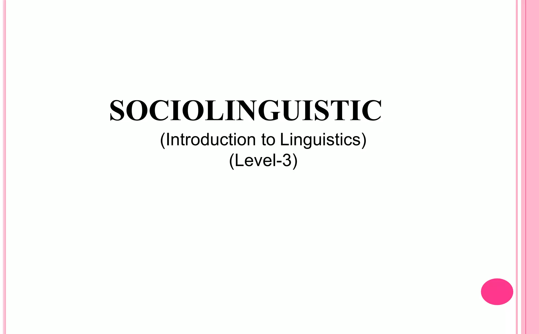 This document defines sociolinguistics and discusses various aspects of language variation. Sociolinguistics is defined as the study of the relationship between language and society. It examines how people vary their language use across different social contexts and how language conveys social meanings. The document also discusses standard and non-standard language varieties, language variation in terms of both users and uses, and other types of language variation including dialect, register, accent, bilingualism/multilingualism, lingua franca, pidgin/creole, and code switching/mixing.