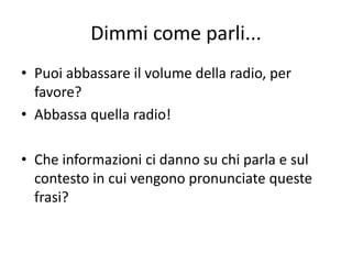 Il documento esplora la sociolinguistica, analizzando come le variazioni linguistiche influenzino la comunicazione in base a fattori geografici, sociali e contestuali. Esempi includono diverse coniugazioni verbali in base al ceto e la differenza tra messaggi inviati tramite sms e lettere. Viene notato come l'uso della forma di cortesia 'voi' stia diminuendo a favore di 'lei' nel linguaggio moderno.