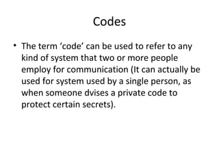 Codes can refer to any system of communication between two or more people. A diglossic situation exists when a society has two distinct codes with clear functional separation, such as one code for formal contexts and another for informal contexts. Ferguson identified four languages that exhibit diglossia: Arabic, Swiss German, Haitian Creole and French, and Greek. Bilingualism is the ability to use two languages effectively while multilingualism involves the ability to use more than two languages. Code-switching and code-mixing are strategies used in multilingual societies where speakers shift between languages. Pidgins and creoles develop from contact between languages, with creoles becoming stabilized first languages. The Sapir-Whorf hypothesis