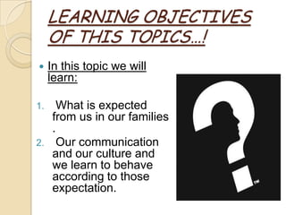 This document discusses social identity and socialization. It defines identity as aspects of oneself including gender, race, ethnicity and religion. People acquire identity through socialization, learning expectations from their family and culture. There are primary identities formed in childhood and secondary identities like occupation. Different theories view identity formation, such as role learning theory focusing on learning social roles, symbolic interactionism seeing it as a creative process, and psychoanalytic theory emphasizing unconscious factors. In conclusion, roles become part of social identity and interaction involves self-presentation to others.