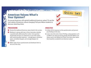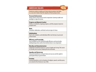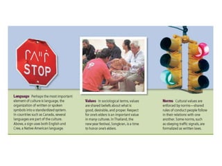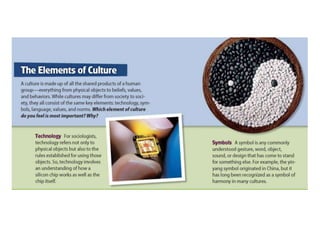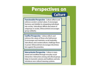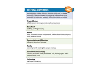 This chapter discusses cultural diversity and conformity. It includes a case study on body rituals among the Nacirema culture. The chapter covers the meaning of culture, cultural variation, and the American value system. It defines culture and its key components, including technology, symbols, language, values, and norms. The chapter also discusses cultural universals, subcultures, countercultures, and processes of cultural change like diffusion and leveling. It identifies core American values like work and individualism and how values have also changed over time with new emphases on environmentalism and self-fulfillment. The chapter concludes with a lab activity having students analyze material culture artifacts.