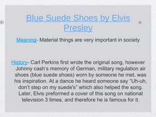 These two songs were chosen to highlight how values and expectations have changed over time. Blue Suede Shoes by Elvis Presley from the 1950s promoted materialism and the importance of possessions. In contrast, Royals by Lorde from 2013 sends the message that wealth and status are not everything, and one should not judge others based on superficial attributes. Both songs impacted society upon their release by influencing cultural views, though in different ways related to the eras in which they were released.