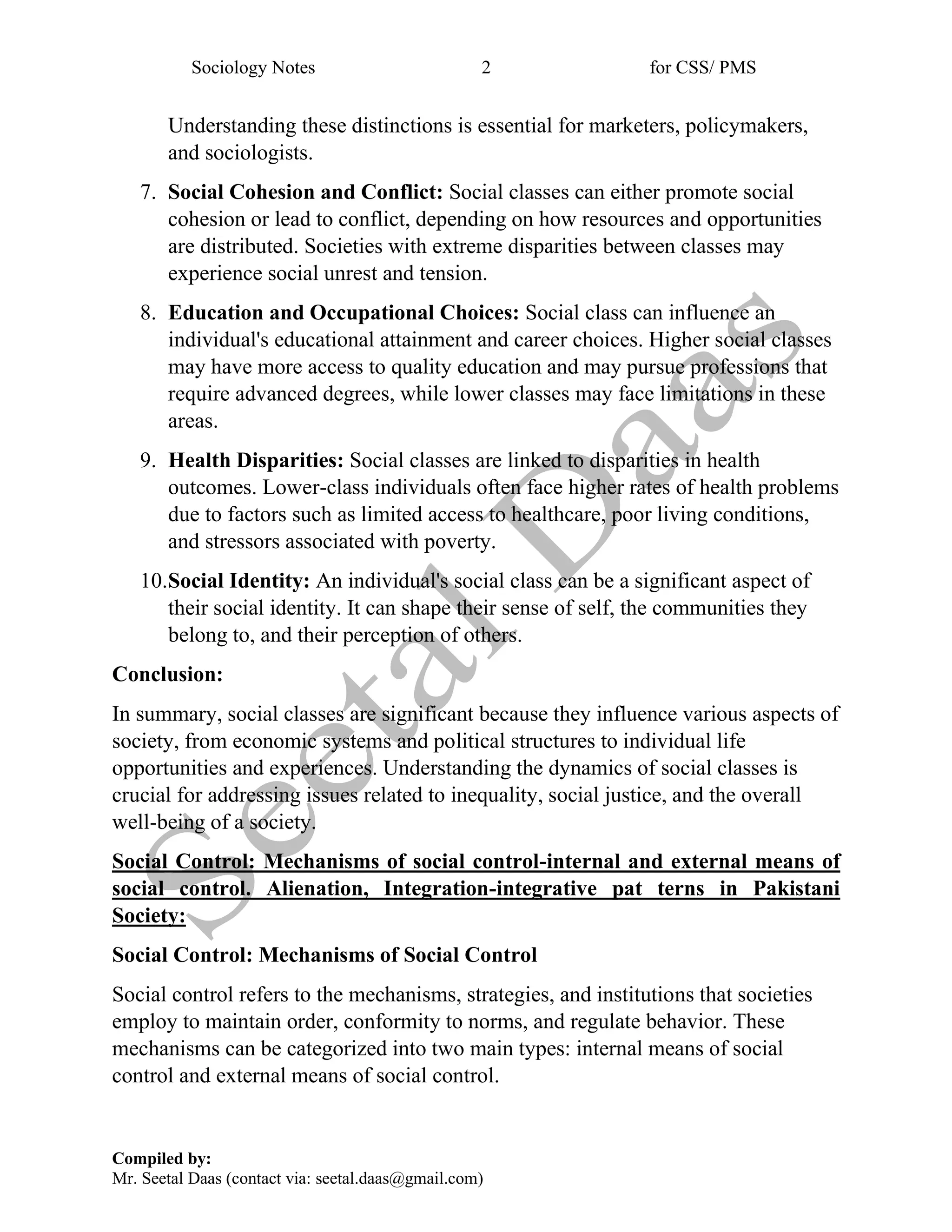 This document provides summaries of key sociological concepts related to social class, social control, integration and alienation in Pakistani society, and rural and urban communities. It discusses the significance of social classes, including their role in social stratification, economic inequality, access to opportunities, social mobility, political power, and cultural differences. It also outlines internal and external mechanisms of social control, such as norms, laws, and peer pressure. Factors contributing to alienation in Pakistani society are explored, as well as ways to promote social integration, including through national identity, education, and economic development. Finally, it describes characteristics of rural communities in Pakistan and contrasts them with urban areas.