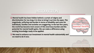 This document discusses mental health issues in India. It begins with an introduction noting the large burden of mental health issues and need to address them. The literature review discusses projections of increased demand for mental health services due to COVID-19. The objectives are understanding youth mental health issues and how to address them. It then discusses what mental health is, myths, the underfunding of mental health in India, effects during COVID-19, ways to overcome issues, the Mental Health Act of 1987, and concludes with developing a self-care support model.
