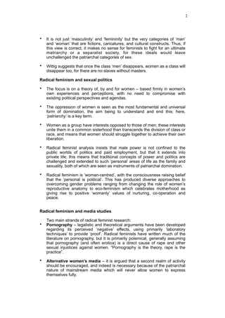 Radical feminism sees patriarchy as a system of male power that oppresses women through social, political, and family structures. Early radical feminism advocated for androgyny and unisex roles, but this view was rejected in favor of acknowledging inherent differences between men and women and the need for feminist struggle and separatism. Radical feminists have debated whether women's oppression stems from their biology or men's biology, and more recently argue that gender itself is a social construct. The movement focuses on women's experiences and aims to understand and end the fundamental oppression of women by patriarchy.
